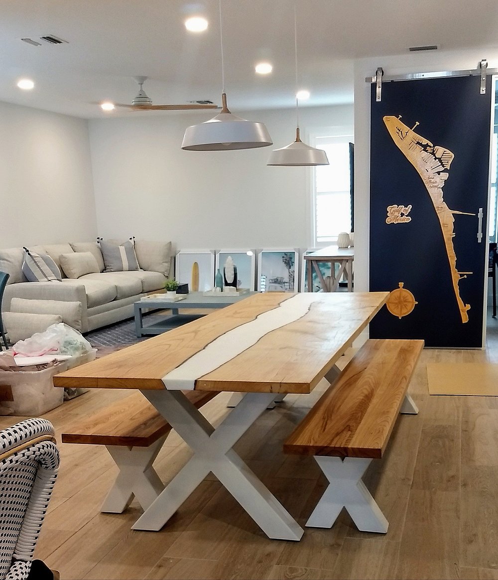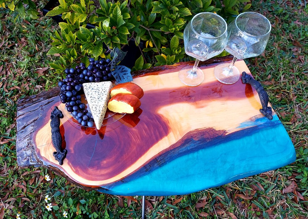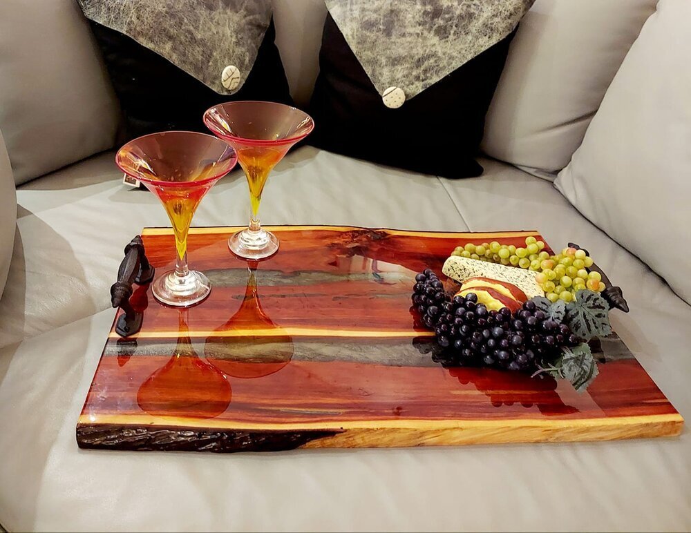 A unique piece would make a perfect gift for anyone who enjoys entertaining. We have made many custom pieces for clients who want to personalize their works. It's always fun to use sports team colors or even put little keepsakes in the "river" to make a tray extra personal.