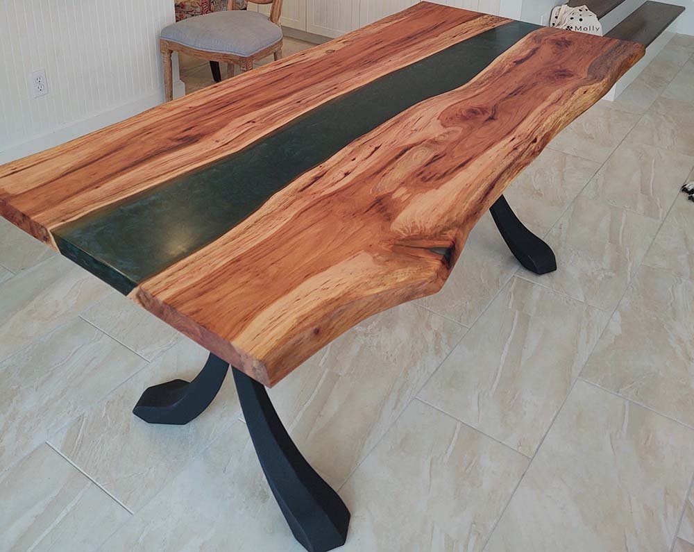 You are welcome to come by our shop to look at the natural slabs we offer or meet us at the lumber store to pick your unique piece. We enjoy including our clients in the process of choosing their unique wood slab that fits the size, color, and shape they are looking for. For example, if you decide to have a river table with the epoxy river running through the center, the color choices are endless. We can match about any color you are looking for.